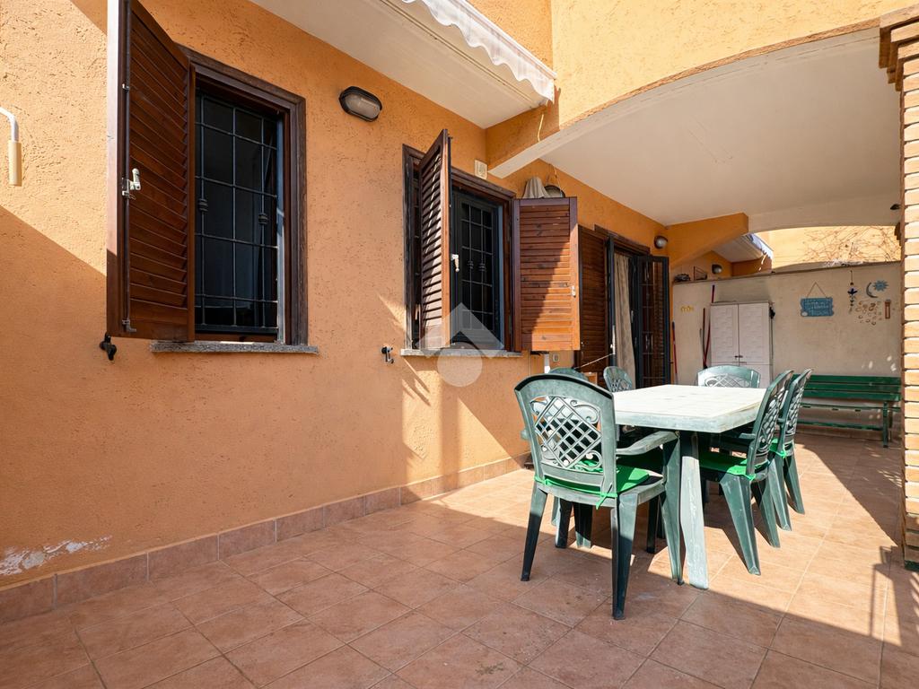 Proseguendo verso l’abitazione troviamo una veranda ampia, comoda e ben vivibile, uno spazio coperto che rappresenta una vera estensione della casa, ideale per pranzi e cene all’aperto, colazioni estive o semplicemente per rilassarsi all’ombra godendo della tranquillità del proprio spazio esterno.
